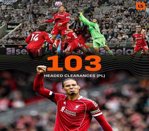据统计,范戴克是本赛季五大联赛至今唯一一位头球解围破百次的球员,达到103次,比其他球员至少多26次。